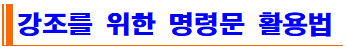령문의 강조는 크게 세 가지 방식으로 나타납니다. 첫째, 어휘적 강조, 둘째, 어조 강조, 셋째, 문법적 강조입니다. 1. 어휘적 강조: 명령문에 ‘please’, ‘right now’, ‘at once’ 같은 어휘를 추가해 강조합니다. 예 : Please sit down. / Call me right now! 이는 요청을 정중하게 만들거나 긴급함을 표현할 때 유용합니다. 2. 어조 강조 : 같은 문장이라도 말하는 사람의 어조에 따라 명령의 강도가 달라집니다. 특히, 구어체에서는 억양이 명령문 전달에 큰 영향을 미칩니다. 예 : “Come here.”라는 문장을 단호하게 말하면 명령이고, 부드럽게 말하면 요청처럼 들릴 수 있습니다. 3. 문법적 강조 : 주어를 생략하지 않고 명시하거나, 문장에 부가 표현을 덧붙이는 방식입니다. 예 : You must listen carefully! / Do sit down! 여기서 “do”를 덧붙이는 것은 문법적으로 강조 효과를 나타내는 방식입니다. 문법적으로는 보통의 명령문보다 더 강한 느낌을 줍니다. 이처럼 명령문의 강조 방식은 상황과 의도에 따라 달라지며, 정확한 표현 선택이 중요합니다. 명령문의 뉘앙스를 조절할 수 있는 능력은 실용 영어에서 매우 중요한 부분입니다.